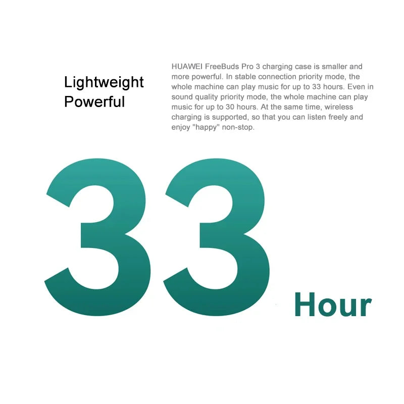 HUAWEI FreeBuds Pro 3 charging case is smaller and more powerful. In stable connection priority mode, the whole machine can play music for up to 33 hours. Even in sound quality priority mode, the whole machine can play music for up to 30 hours. At the same time, wireless charging is supported, so that you can listen freely and enjoy "happy" non-stop.